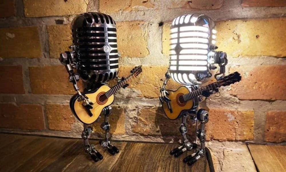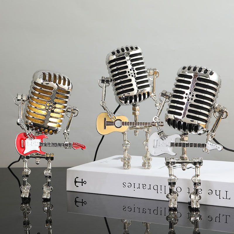 Inspirada en un micrófono clásico, tres artistas la crearon de metal con un diseño steampunk, completa con una guitarra en sus manos.