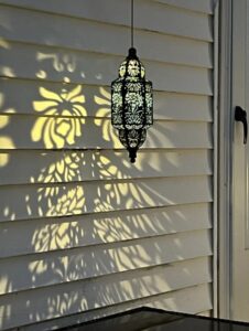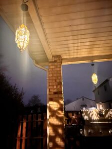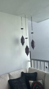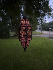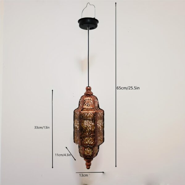 El farol pesa 2.5 libras y viene con una cadena resistente y gancho clasificado para 15 libras. Usa el anclaje de techo incluido para pérgolas o aleros. En áreas de mucho viento (más de 40 mph), considera agregar un segundo punto de montaje o guardarlo durante advertencias de clima severo.
