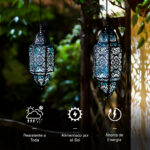 El farol pesa 2.5 libras y viene con una cadena resistente y gancho clasificado para 15 libras. Usa el anclaje de techo incluido para pérgolas o aleros. En áreas de mucho viento (más de 40 mph), considera agregar un segundo punto de montaje o guardarlo durante advertencias de clima severo.