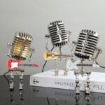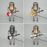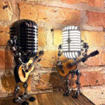 La Lámpara Rockera es una pieza de arte única e inspirada en el estilo retro, diseñada para parecer un mini guitarrista con micrófono. Hecha de metal con un diseño steampunk, es perfecta para amantes de la música, entusiastas del arte y cualquiera que disfrute de la decoración peculiar.