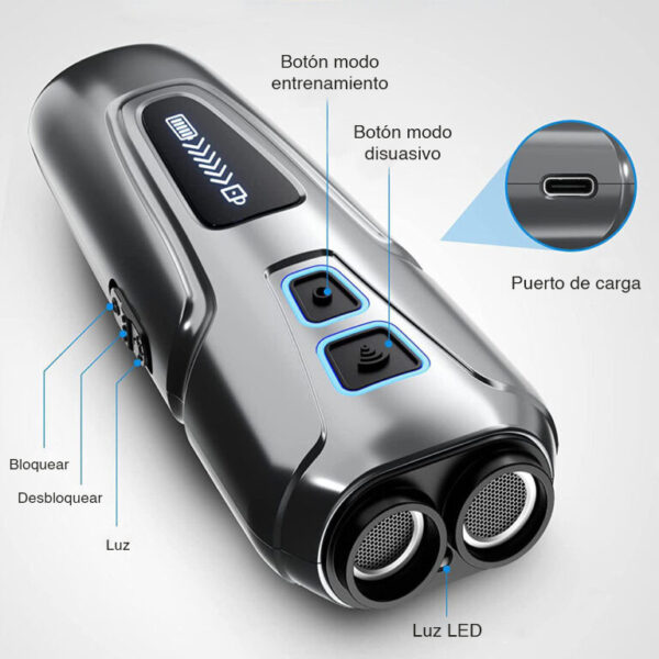 La luz LED es un destello breve y suave—más como el flash de una cámara que como un estroboscopio. No lastima ni daña la visión de tu perro. Está diseñado para funcionar como un disruptor visual rápido, no como un castigo.