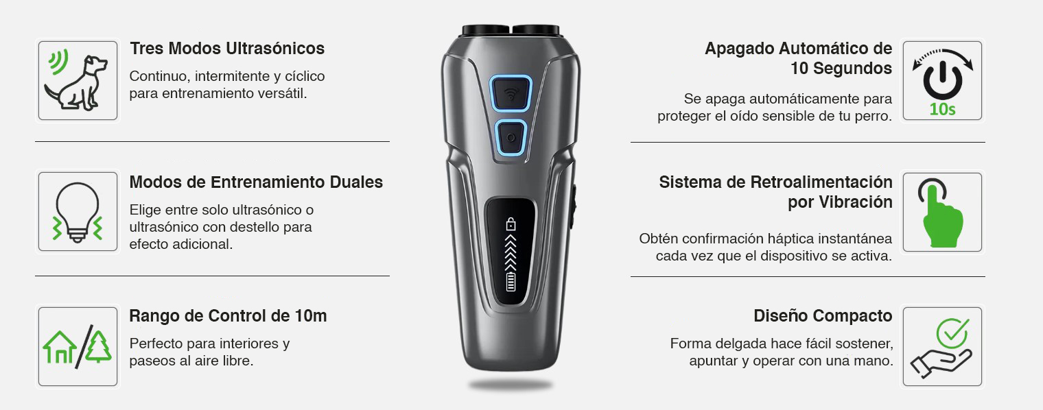 Controla los ladridos, saltos, mordisqueos y excavaciones usando un tono ultrasónico inofensivo al que tu perro responderá—sin dolor, solo resultados.
