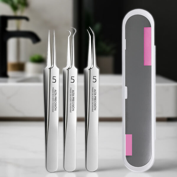 Esta no es una herramienta de un solo uso que únicamente maneja puntos negros. Las pinzas de precisión funcionan efectivamente en espinillas blancas que están listas para extraer, esas bolitas persistentes de milio bajo los ojos que los dermatólogos cobran cientos de euros por remover, e incluso vellos encarnados después de depilarse o afeitarse. Ya sea que el problema esté en la cara, línea del bikini o las piernas, el mismo kit maneja todo. Eso significa que comprar un producto resuelve múltiples frustraciones de la piel en lugar de necesitar herramientas separadas para cada preocupación.