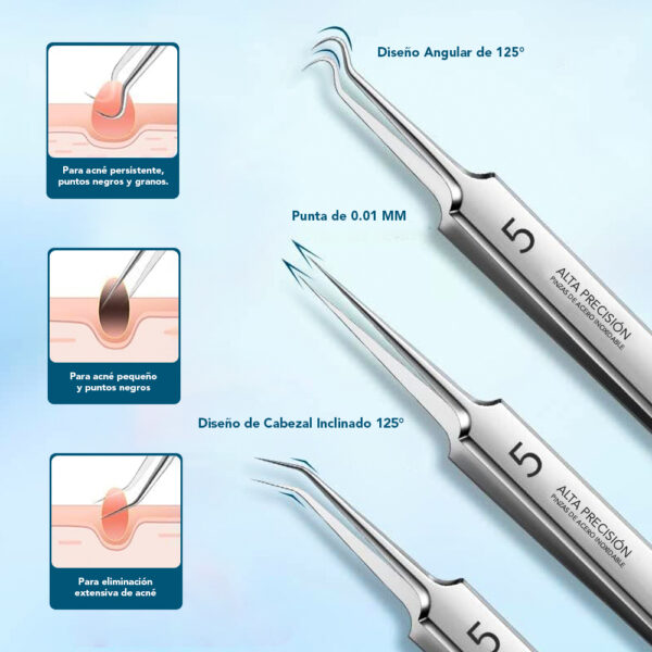 El kit incluye tres herramientas de extracción diferentes diseñadas para necesidades específicas. El diseño angular de 125° ataca granos y espinillas persistentes con precisión, la punta ultra-fina de 0.01MM alcanza los puntos negros más pequeños que otras herramientas no pueden tocar, y el cabezal inclinado de 45° maneja extracciones extensas en áreas más grandes. En lugar de adivinar qué herramienta usar, cada punta está diseñada para una situación diferente, así cualquier persona puede extraer con confianza sin causar daño o irritación.